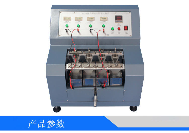 产品简介: 皮革、人造皮、布料┅等,在外围有水之下,施以挠折动作,以测知材料耐渗透指数。 测试件数 1-4 件 计数器 4组,LCD,0~999999,4sets ** 90W 体积49×45×45cm 重量 55kg 电源 1∮, AC220V, 2 A