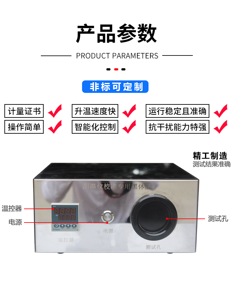 型号名称:ASR-CWY-01 测温范围:35-50C°可调 操作:按键式 温度分辨率:0.01℃ 腔口直径:Φ56mm 腔深:150mm 腔口发射率:≥0.99 温度稳定性:±(0.1~0.2)℃/10min 温度均匀性:±0.1C° 电源:220V AC 50HZ 100W 重量:约3.0Kg 外形尺寸:125mm*305mm*280mm(长*宽*高)